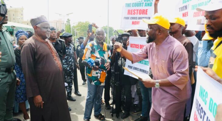 POLITICS : PROF. IMUMOLEN TAKES PROTEST TO INEC HQTRS, DEMANDS IMMEDIATE RECOGNITION OF ACCORD PARTY LEADERSHIP